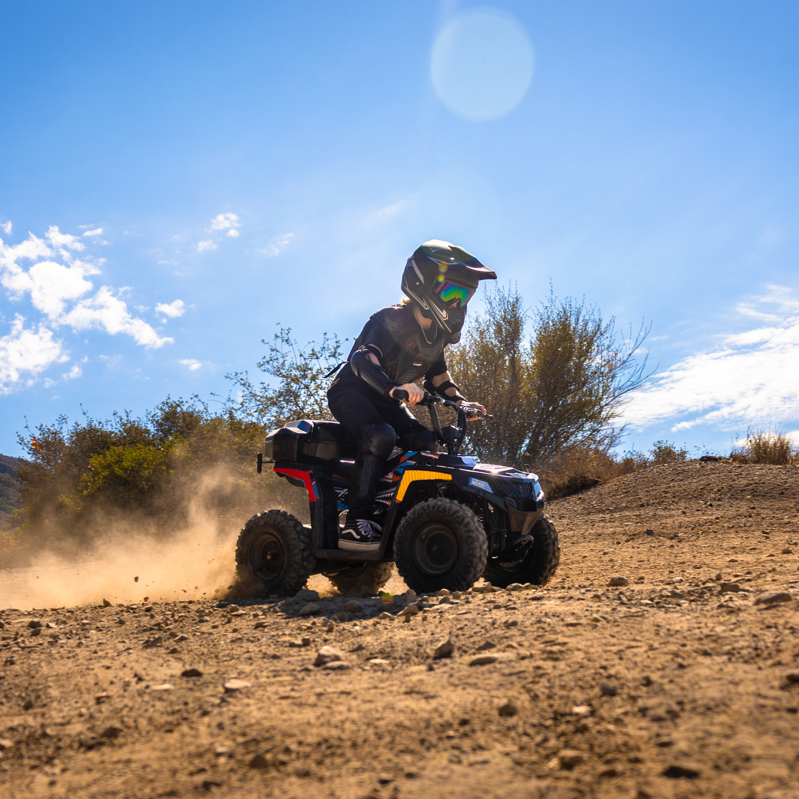 Meet the Animal - the powerful electric ATV made for adventurous kids ages 6 and up. Boasting speeds up to 15 mph, Animal dominates any terrain for up to 10 miles. The long-lasting LFP battery is safer and more durable than lithium-ion batteries- giving you the confidence to ride longer. Built with thoughtful features such as a Forward/Reverse switch, Speed Control Key, and Full Suspension, your kids have found a new reason to explore the outdoors.
